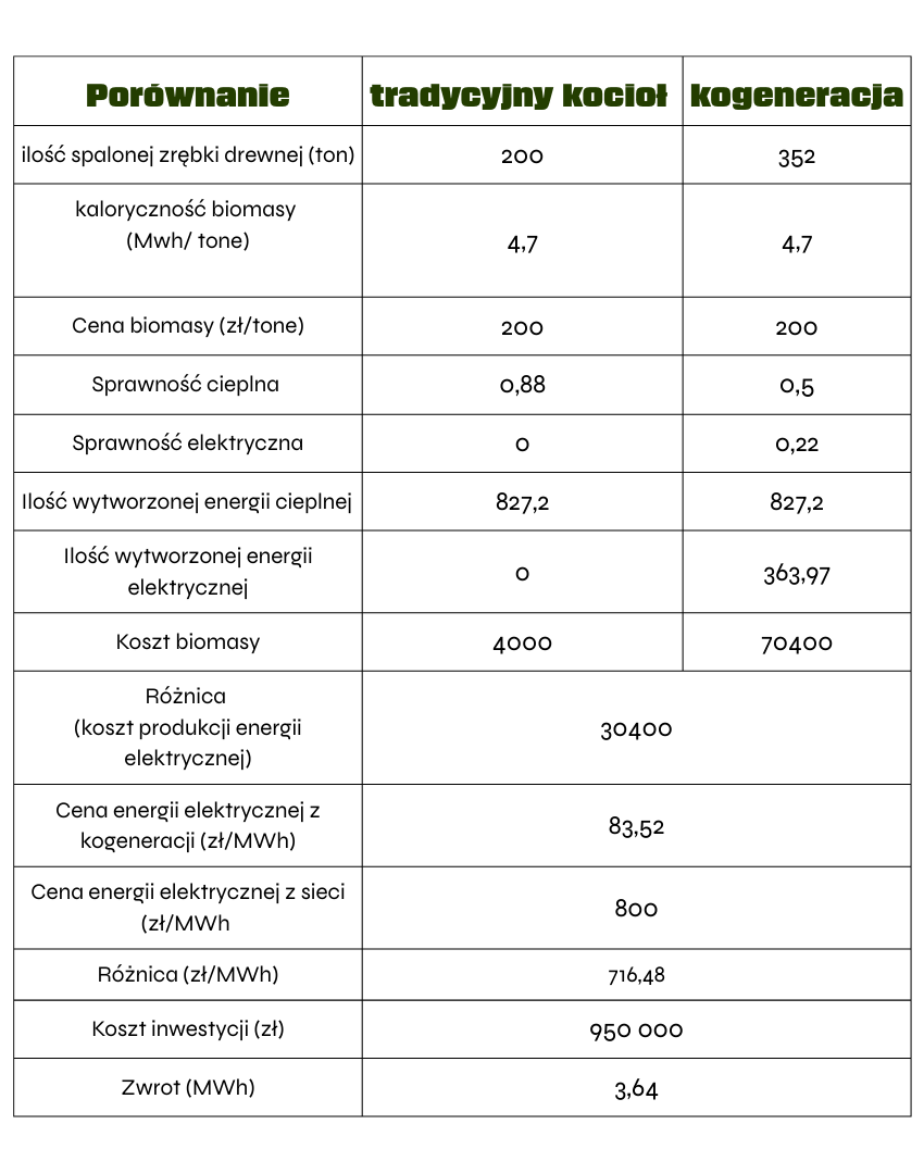 Porównując z nowoczesnym kotłem na biomasę o sprawności 88% (η = 0,88), zastosowanie kogeneracji wymaga spalenia około 76% więcej biomasy, aby wyprodukować tę samą ilość ciepła. Jednak z nadwyżki biomasy uzyskujemy dodatkowo 22% energii elektrycznej, co znacznie ulepsza wynik bilansu kosztów energii w firmie.